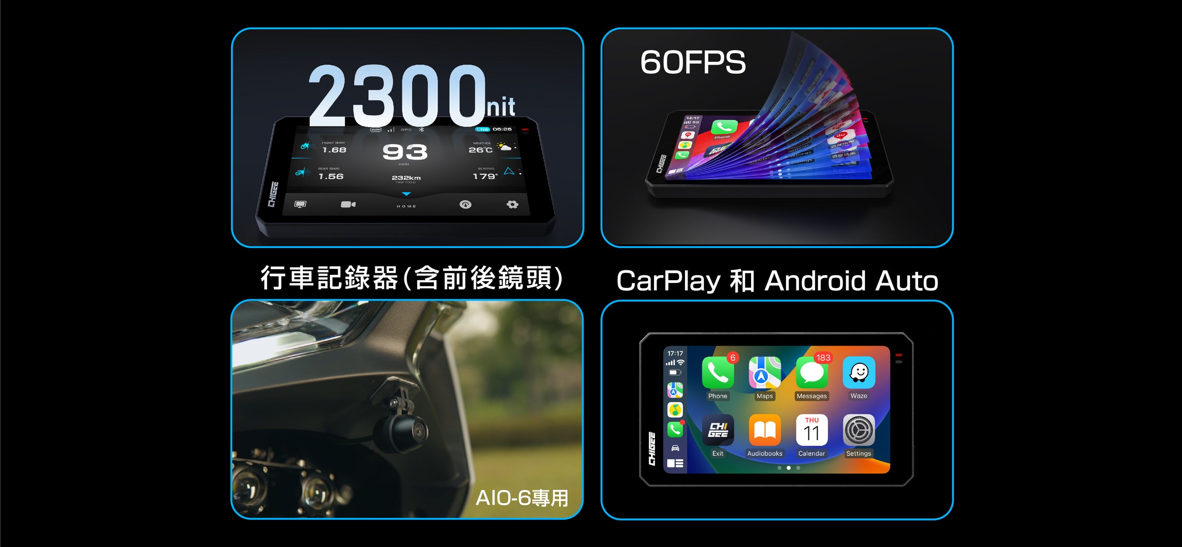 AIO-6 專為機車使用外,更可以安裝於汽車上,另選購專用車載支架一起使用時,也能在汽車內提供實用的 Carplay 導航體驗,隨時在機車和汽車之間切換。